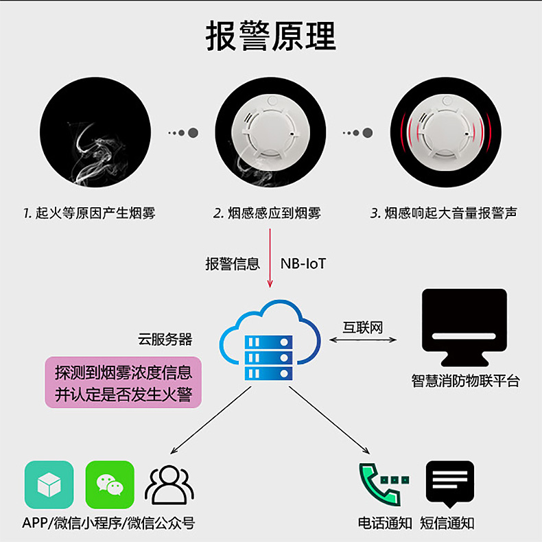 在物品易堆叠、少人员进出或放置易燃物品的区域,比如储藏间、厨房、堆满纸箱的房间,可安装驿通智能研发的NB-loT烟感报警器。内置高性能进口芯片,对环境烟雾具有极高的灵敏度,当烟雾浓度达到0.11dB/m立刻触发现场报警装置,同时推送报警信息至管理后台、手机APP、微信及手机短信,即使无人在现场,也可以掌握对应监测区域的消防安全情况。